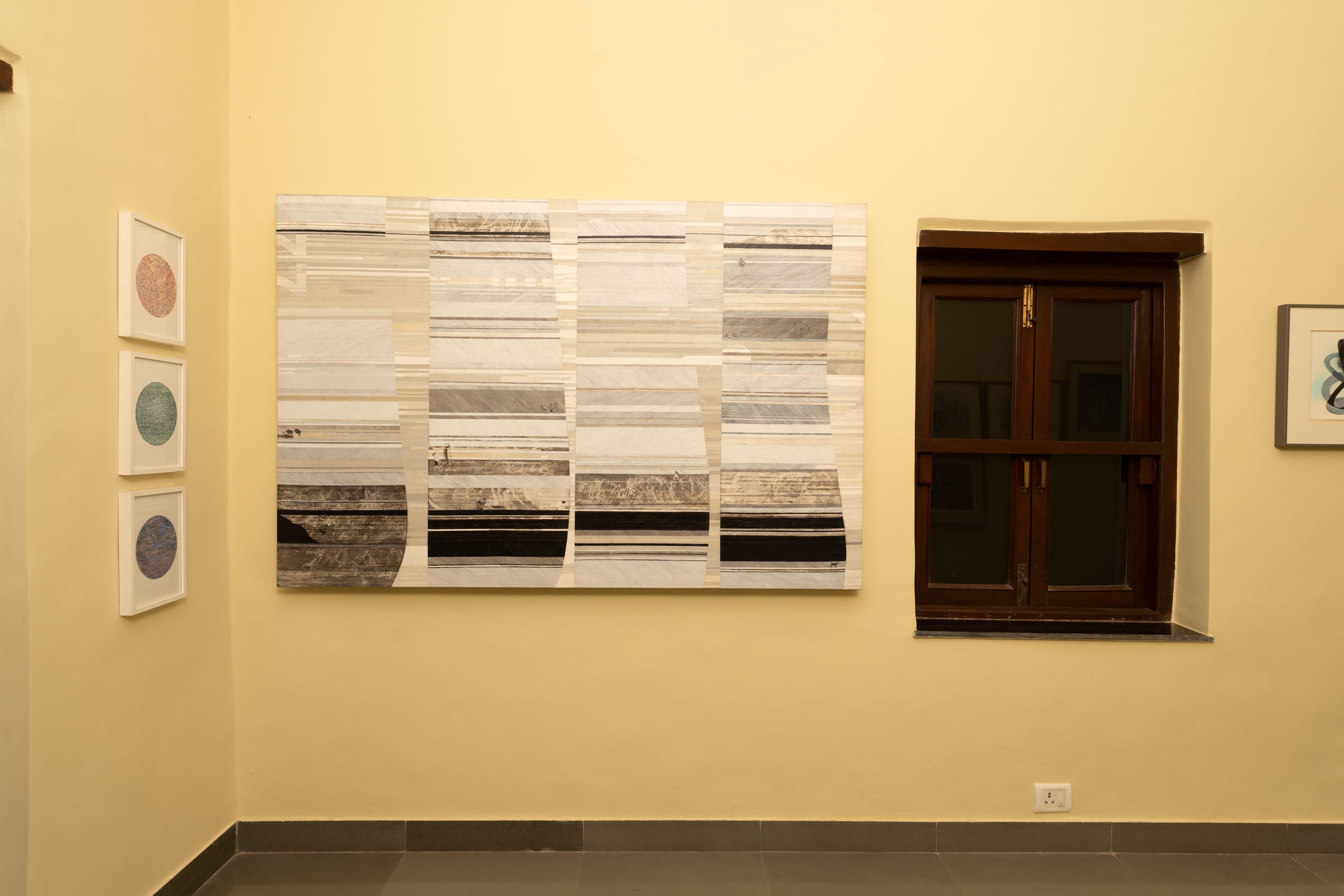 Representing the 'eye' as both a medium of seeing and being seen, Sharmistha Ray, through the Blindspot series, merges automatic writing with visual script, abstraction, and symbolism to explore their inner consciousness. Savia Mahajan navigates the liminal space between life and death, exploring the dynamic interplay between material and form in Rich Deposits 2 and 3, where spiritual universality meets the material process of making and breaking. Line-based interventions integrate architecture as an active participant in #76, exploring how light, structure, and movement shape spatial perception. Repetition, geometry, and rhythm intertwine in Parul Gupta's work, inviting a heightened experience of space. Madhav Imartey transcends the conventions of still life, imbuing objects, machines, and products with human traits and personalities. Animated and exuberant, these objects transform into portraits, asserting their presence as more than mere representations of daily life.